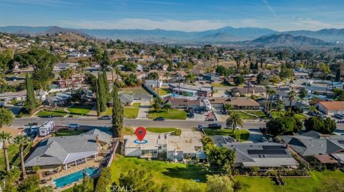 The single-family property is placed at the end of the street at 7132 Alviso Ave, Riverside, CA.